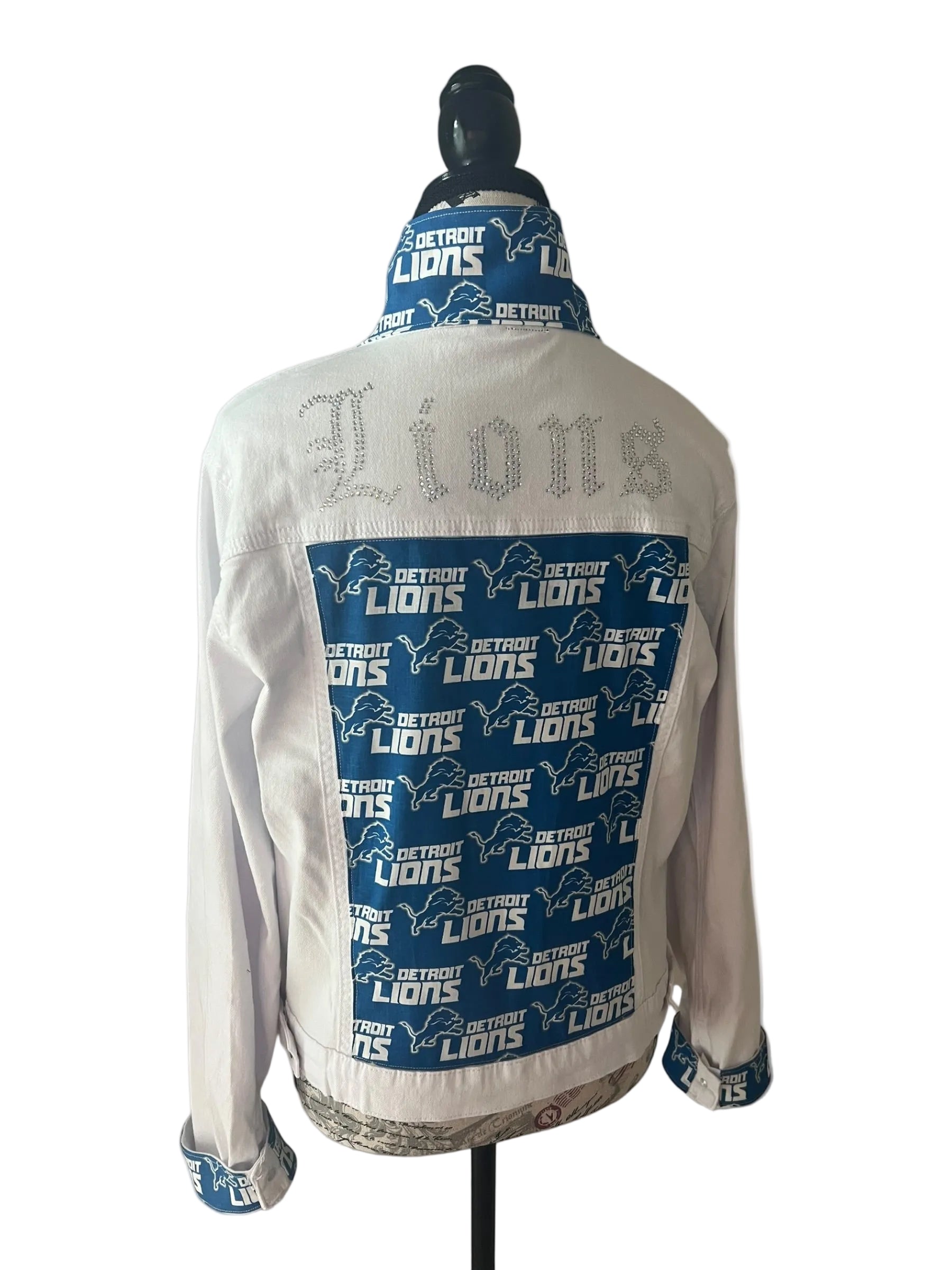 This white stretch denim jacket is a bold tribute to Detroit-inspired fan fashion. Featuring team-inspired fabric accents on the back, collar, and cuffs, this one-of-a-kind piece is finished with “Lions” spelled out in sparkling rhinestones across the back for standout shine.