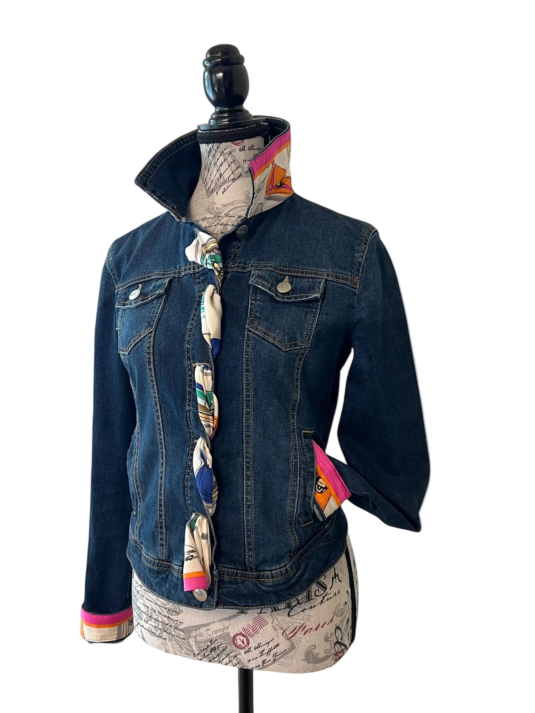 Designed for a very fitted silhouette (fits like a size 2), this statement piece is crafted from soft stretch denim for comfort and contour. It is custom-finished with vibrant fuchsia and orange accents created from a repurposed designer scarf, adding bold color and high-impact detail to a classic denim base.