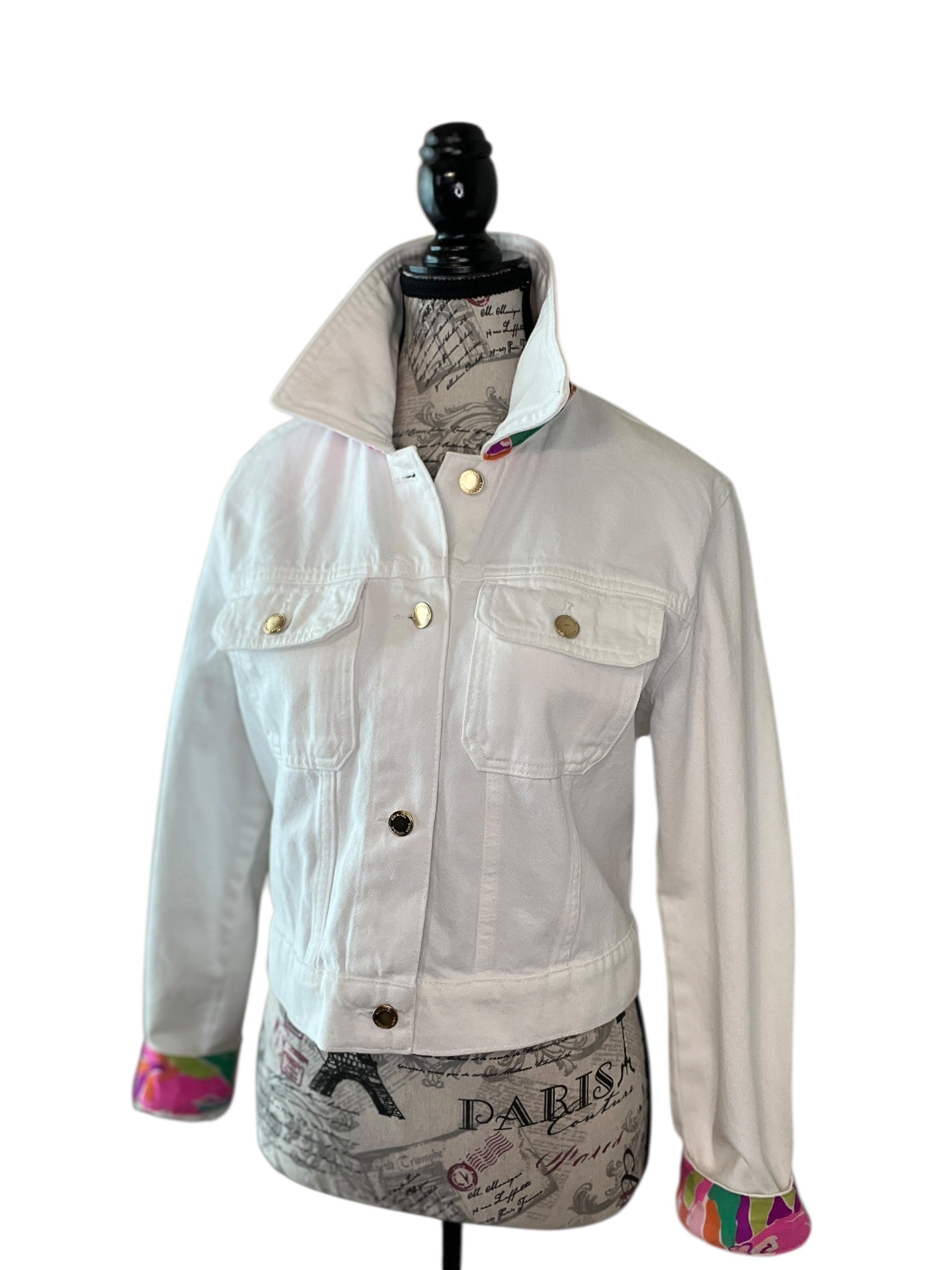 Bring effortless sunshine to your wardrobe with this one-of-a-kind white denim jacket from the Lilly-Inspired Collection by Lux Royal Threads.