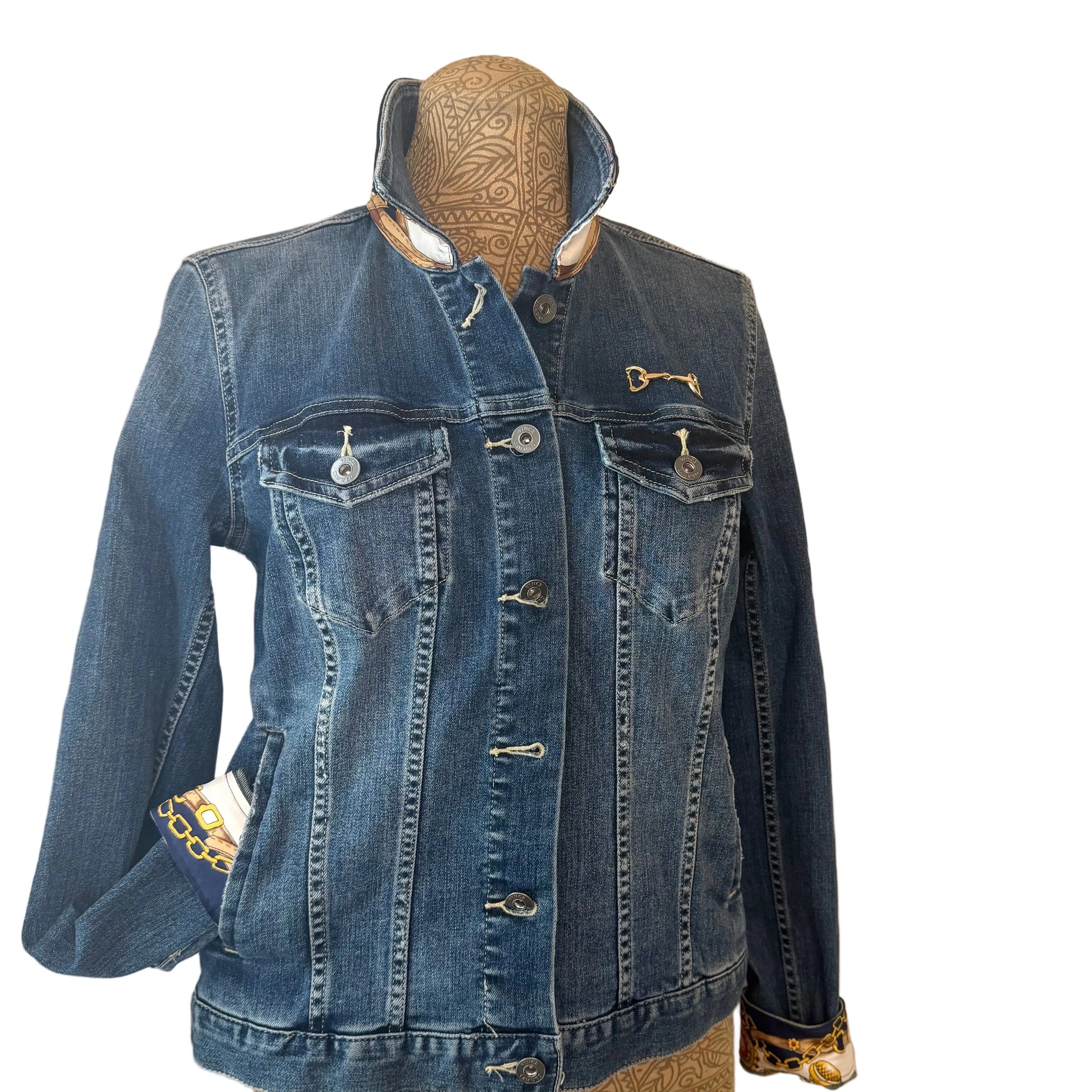 Crafted from an upcycled Vince Camuto medium blue denim jacket in size Small, this piece is thoughtfully redesigned with a luxurious silk scarf featuring classic equestrian motifs in rich red and navy tones. The silk fabric is carefully placed along the collar, cuffs, and back panel, creating a striking contrast against the timeless denim base.